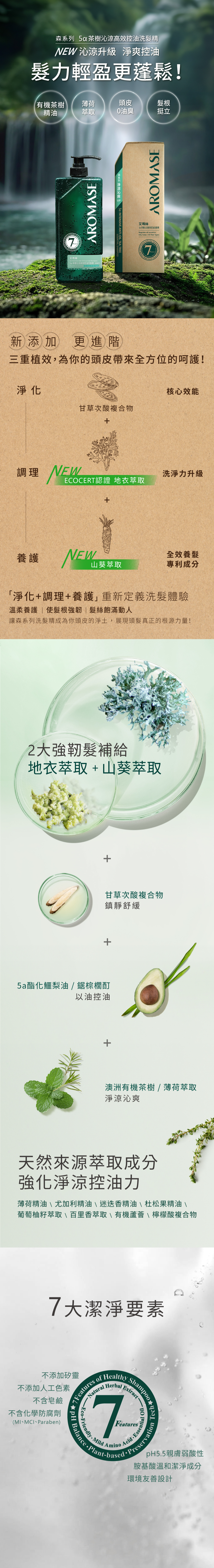 ▪森系列洗髮精新添加 「專利」 地衣萃取+山葵萃取 「淨化+調理+養護」